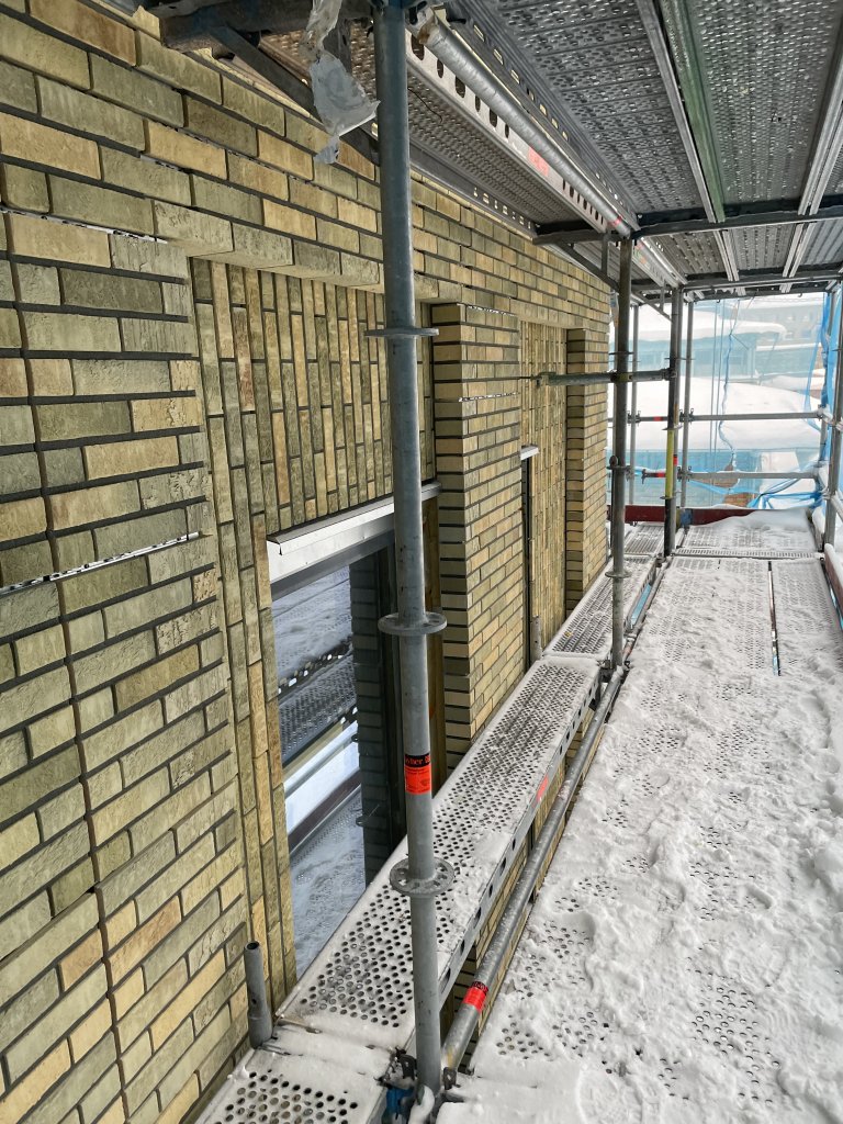 Renovering av tegelfasad. Den gamla murningen från 1967 revs och ersattes mot 100mm tilläggsisolering och en ny tegelfasad från Stofix. Utseende och fasadtjocklek blev i slutändan identiskt.
